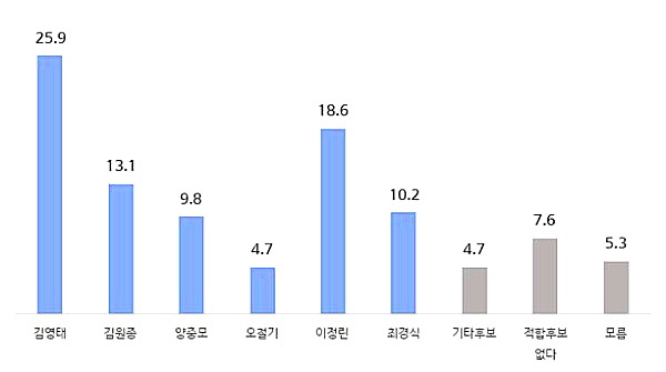 김영태 의장 27.5%, 양충모 전 청장 21.3%, 이정린 도의원 20.2%, 김원종 전 행정관 9.4%, 최경식 시장 9.0%, 오철기 부위원장 4.7%