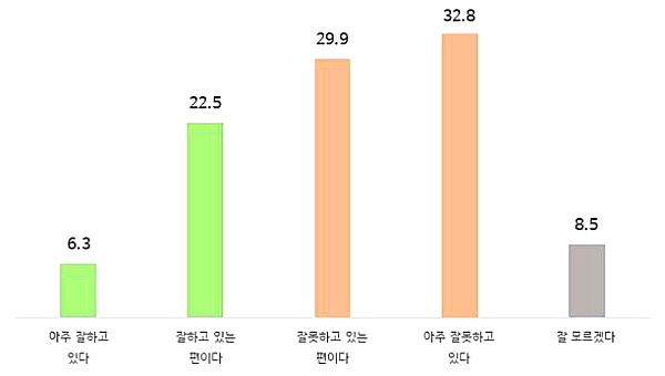 - 세부적으로 ‘아주 잘하고 있다’ 6,3%, ‘잘하고 있는 편이다’ 22.5%, ‘잘못하고 있는 편이다’ 29.9%, ‘아주 잘못하고 있다’ 32.8%, ‘잘 모르겠다’ 8.5% 순으로 응답했다.