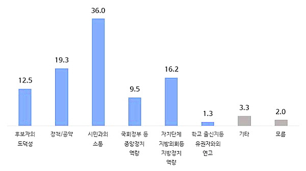 시민과의 소통 36.0%, 정책 및 공약 19.3%, 자치단체 지방의회 등 지방정치역량 16.2%, 후보자의 도덕성 12.5%, 국회정부 등 중앙정치역량 9.5%, 학교 출신지 등 유권자와의 연고 1.3%, 기타 3.3%, 모름 2.0%