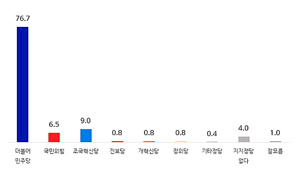 더불어민주당 76.7%, 조국혁신당 9.0%, 국민의힘 6.5%, 진보당 0.8%, 개혁신당 0.8%, 정의당 0.8%, 기타정당 0.4%, ‘지지정당 없다’ 4.0%, ‘잘모름’ 1.0%