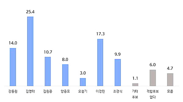 김영태 의장 25.4%, 이정린 현 전북도의원 17.3%, 강동원 전 국회의원 14.0%, 김원종 전 청와대 선임행정관 10.7%, 최경식 현 남원시장 9.9%, 양충모 전 새만금개발청장 8.0%, 오철기 전 전북대학교 총동문회 부회장 3.0%, ‘기타후보’ 1.1%, ‘적합 후보가 없다’ 6.0%, ‘잘 모르겠다’ 4.7%