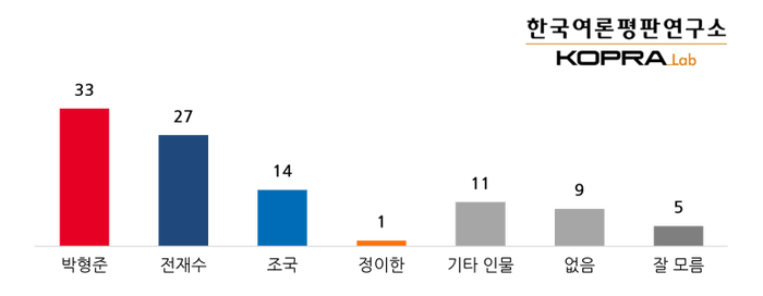 국민의힘 소속인 박형준 부산시장 33%, 더불어민주당 소속 전재수 해양수산부 장관 27%, 조국 조국혁신당 대표 14%, 기타인물 11%, 없음 9%, 잘모름 5%, 정이한 개혁신당 대변인 1%