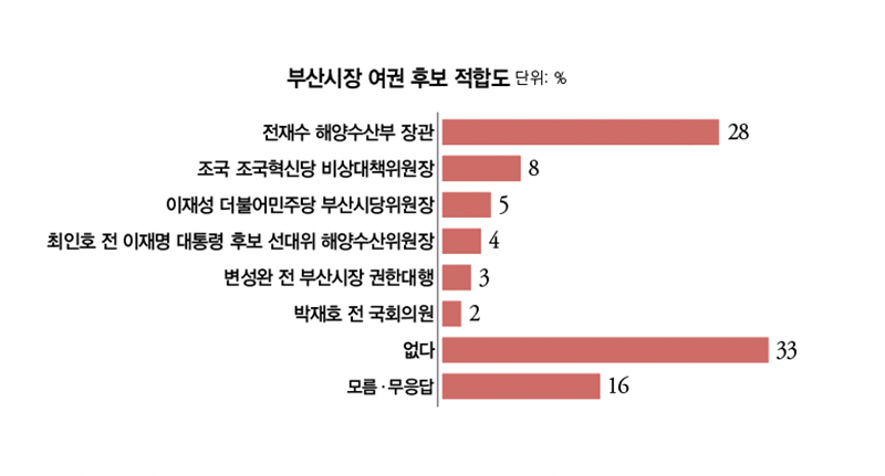 전재수 장관 28%, 조국 전 대표 8%, ‘적합한 후보가 없다’ 33%