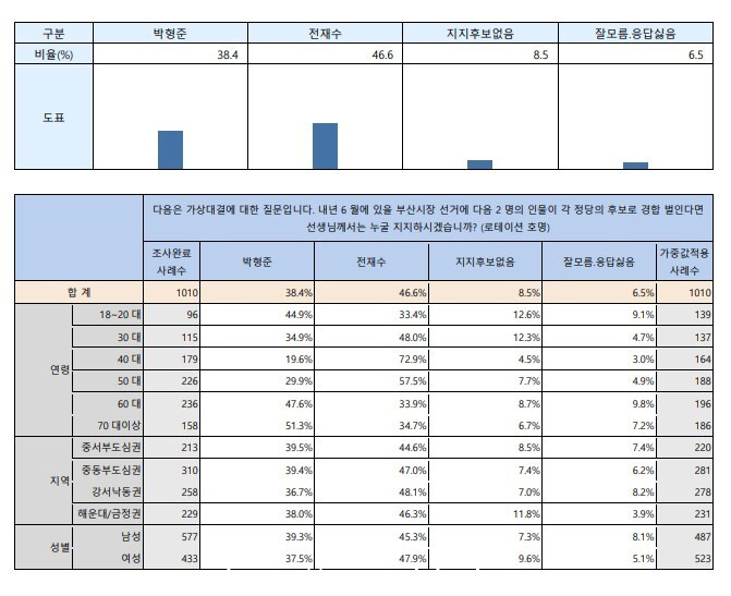 더불어민주당 전재수 장관 46.6%, 국민의힘 박형준 시장 38.4%, ‘지지후보 없음’ 8.5%, ‘잘 모름/응답 거절’ 6.5%