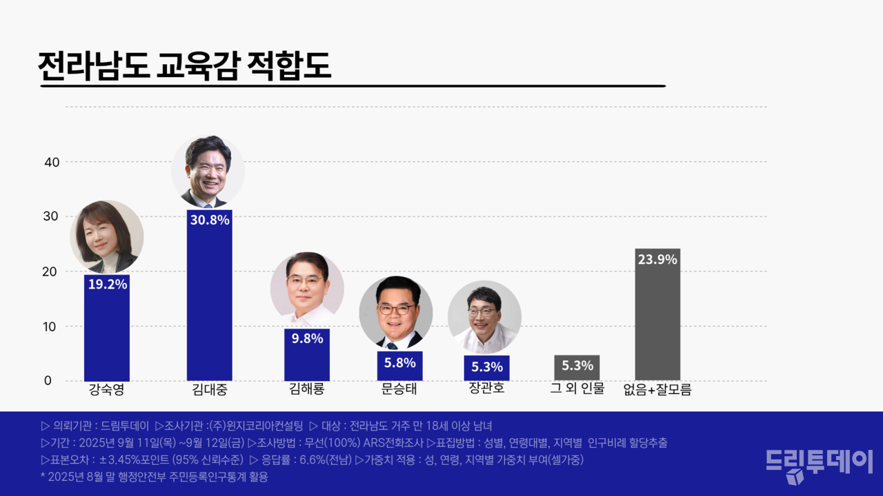 김대중 교육감 30.8%, 강숙영 전 전남도교육청 장학관 19.2%, 김해룡 전 전남도교육청 여수교육장 9.8%, 문승태 순천대 대외협력 부총장 5.8%, 장관호 전 전교조 전남지부장 5.3%, ‘그 외 다른 인물’ 5.3%, ‘적합한 후보가 없다’ 11.3%, ‘잘 모르겠다’ 12.6%