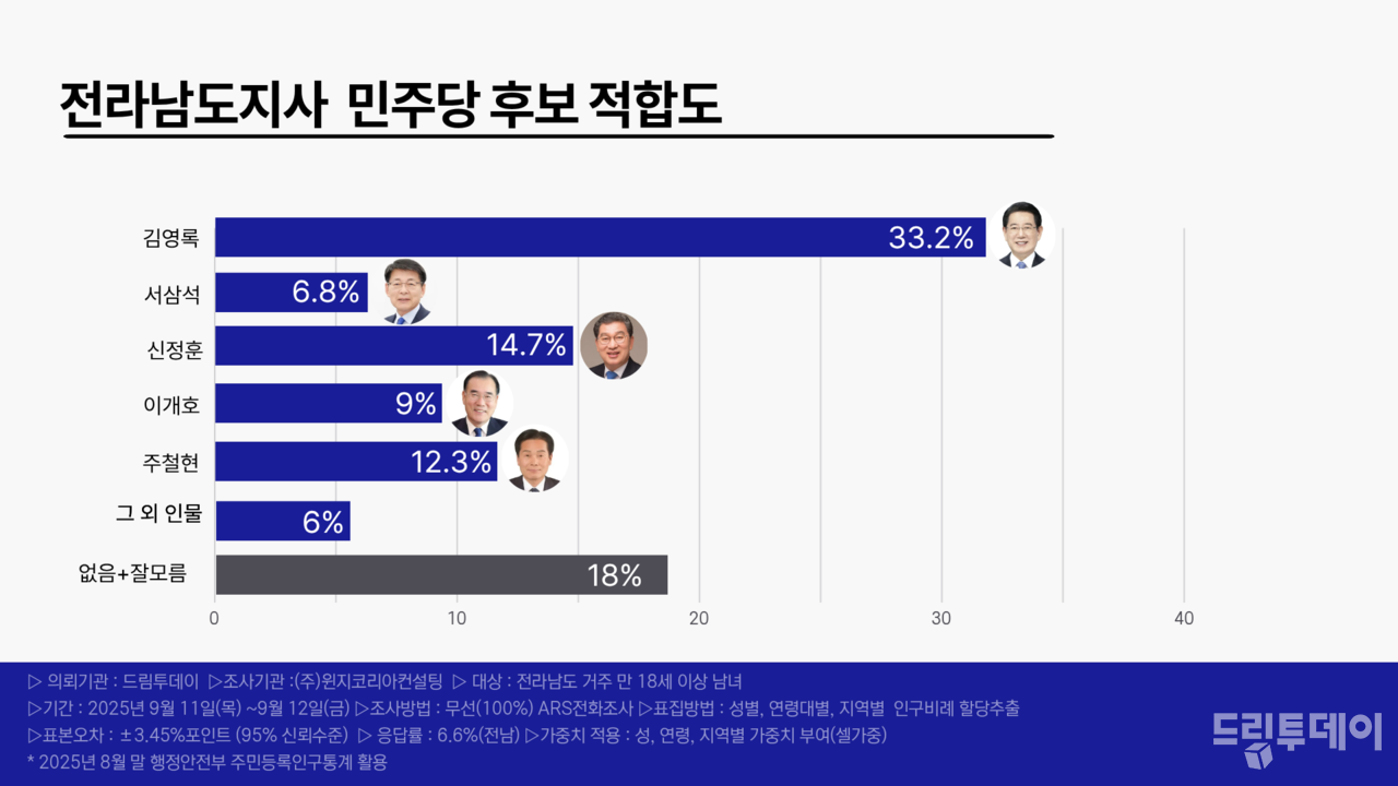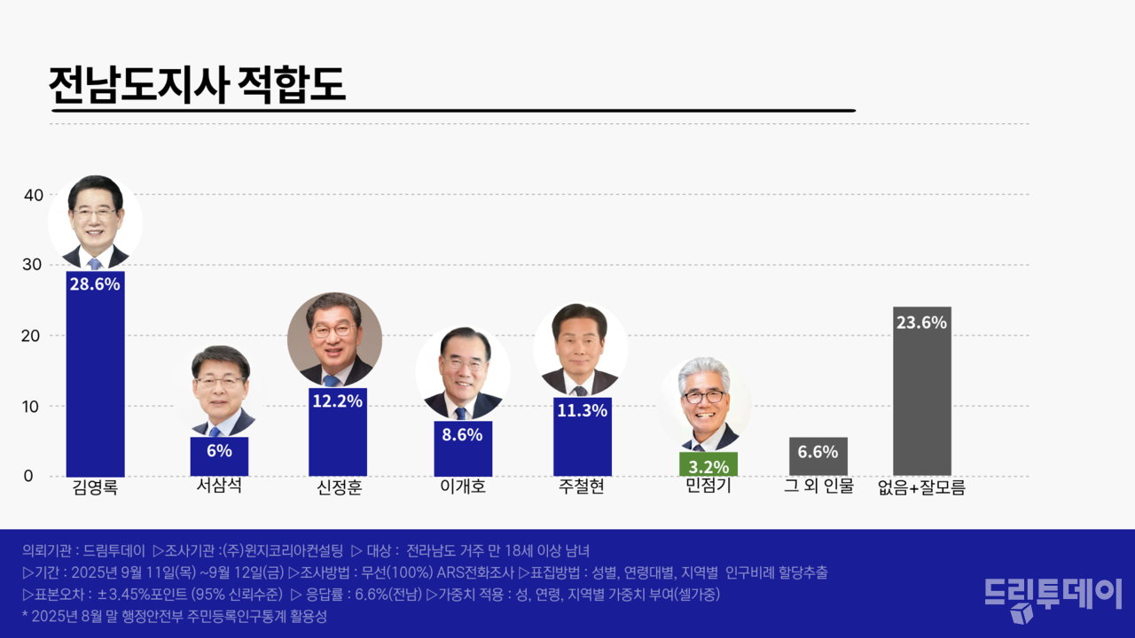 김영록 지사 33.2%, 신정훈 의원 14.7%, 주철현 의원 12.3%, 이개호 의원 9.0%, 서삼석 의원 6.8%, ‘그 외 다른 인물’ 6.0%, ‘적합한 후보가 없다’ 8.7%, ‘잘 모르겠다’ 9.2%