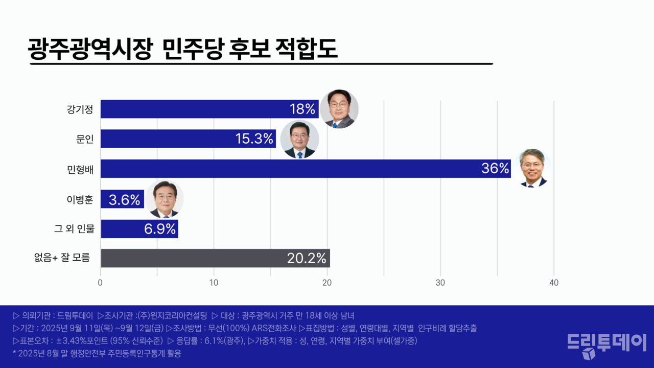 민형배 의원 36.0%, 강기정 시장 18.0%, 문인 북구청장 15.3%, 이병훈 부위원장 3.6%, ‘그 외 다른 인물’ 6.9%, ‘적합한 후보가 없다’ 11.2%, ‘잘 모르겠다’ 9.0%