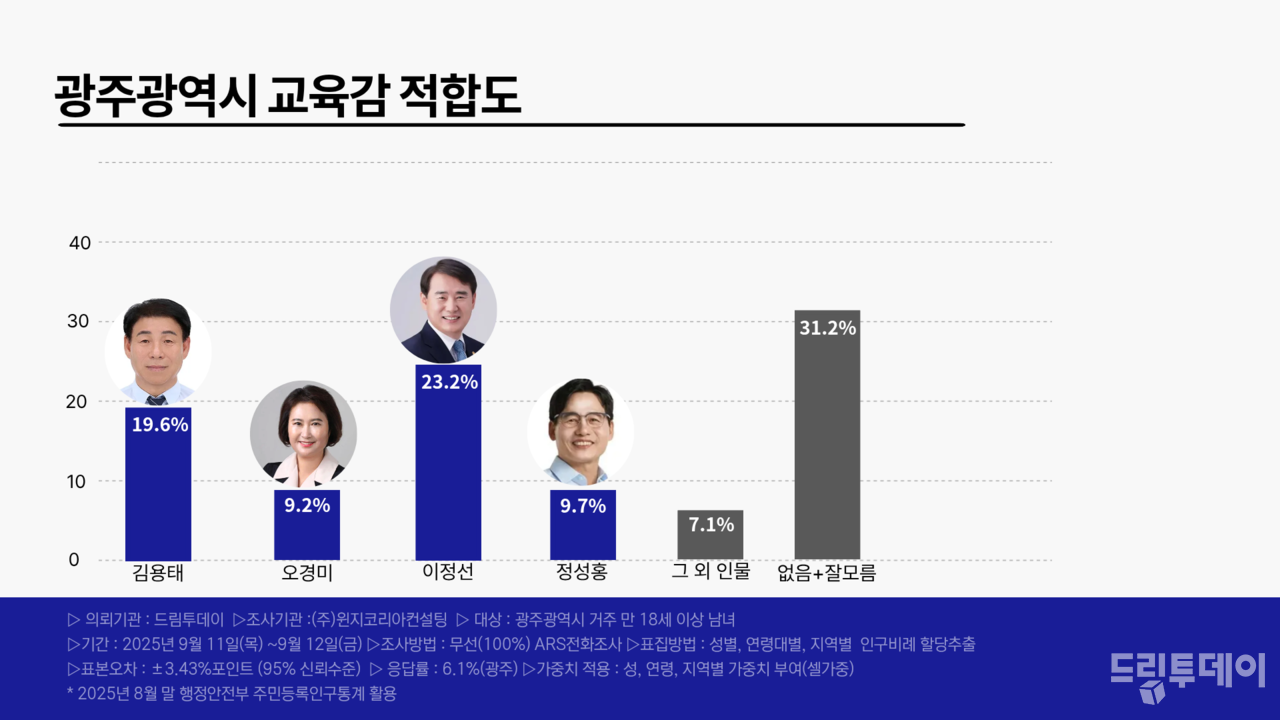 드림투데이 의뢰, 윈지코리아컨설팅 9월 11일-12일 광주 거주 만 18세 이상 남녀 816명 대상 조사