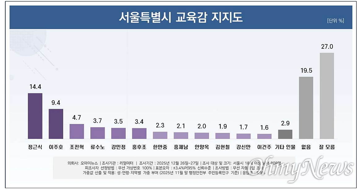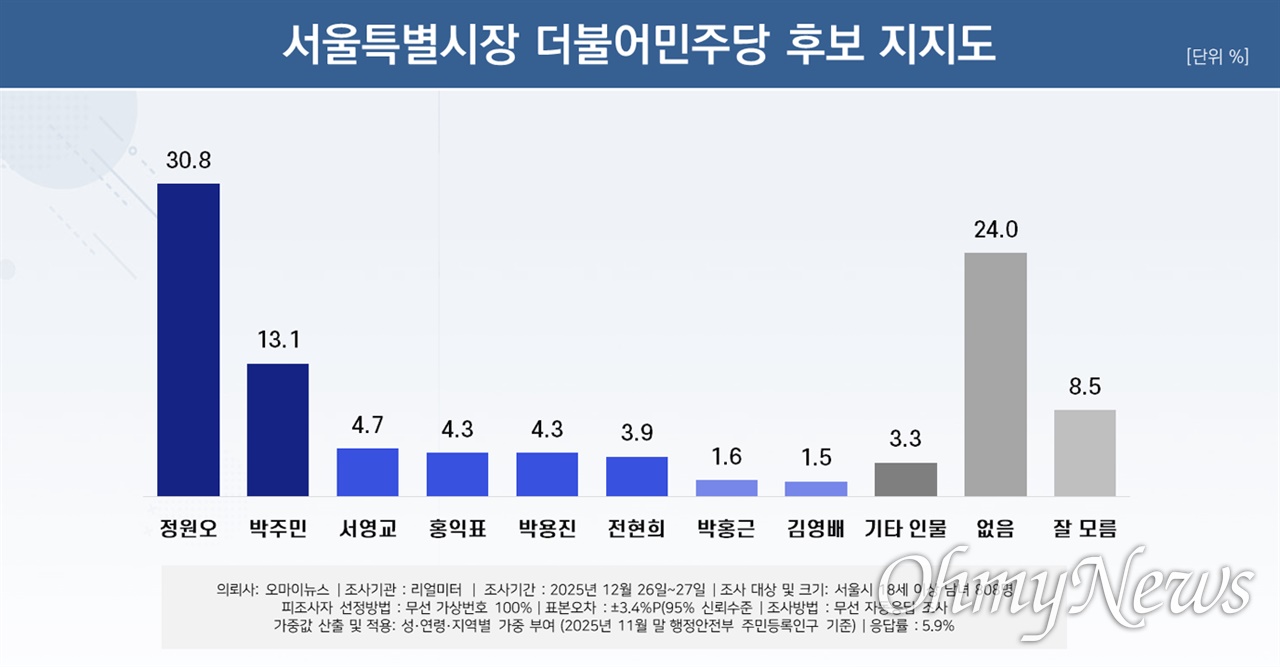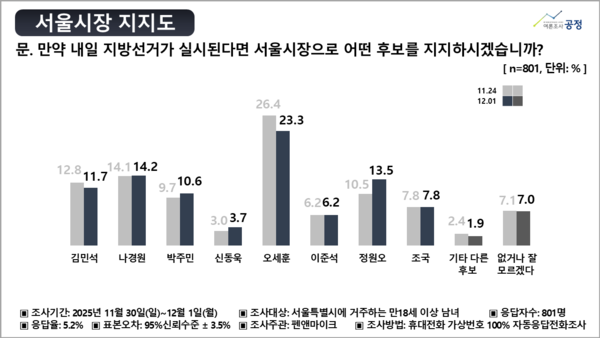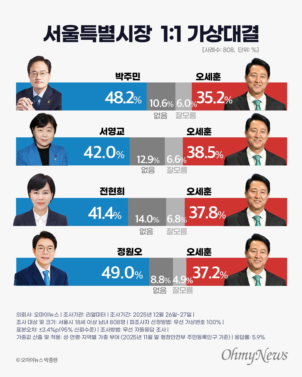오마이뉴스 의뢰, 리얼미터 12월 26일-27일 만 18세 이상 서울시민 808명 대상 조사