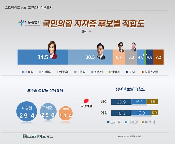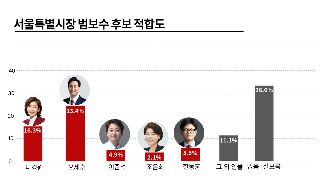 오세훈 서울시장 18.7%, 나경원 의원 16.0%, 이준석 개혁신당 대표 8.7%, 한동훈 전 국민의힘 대표 8.5%, 조은희 국민의힘 의원 4.4%, 권영세 국민의힘 의원 2.2%, '그외 후보' 4.0%, ‘적합 후보 없음’ 31.0%, ‘모름’ 6.4%