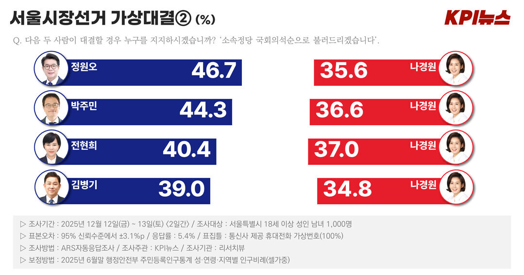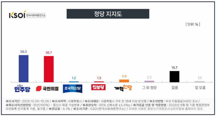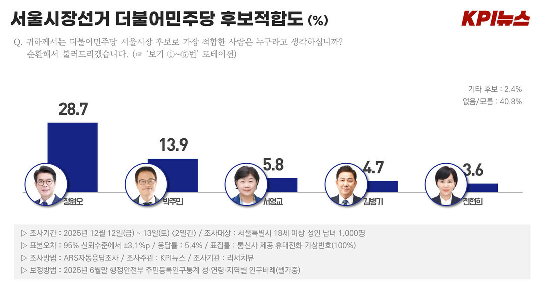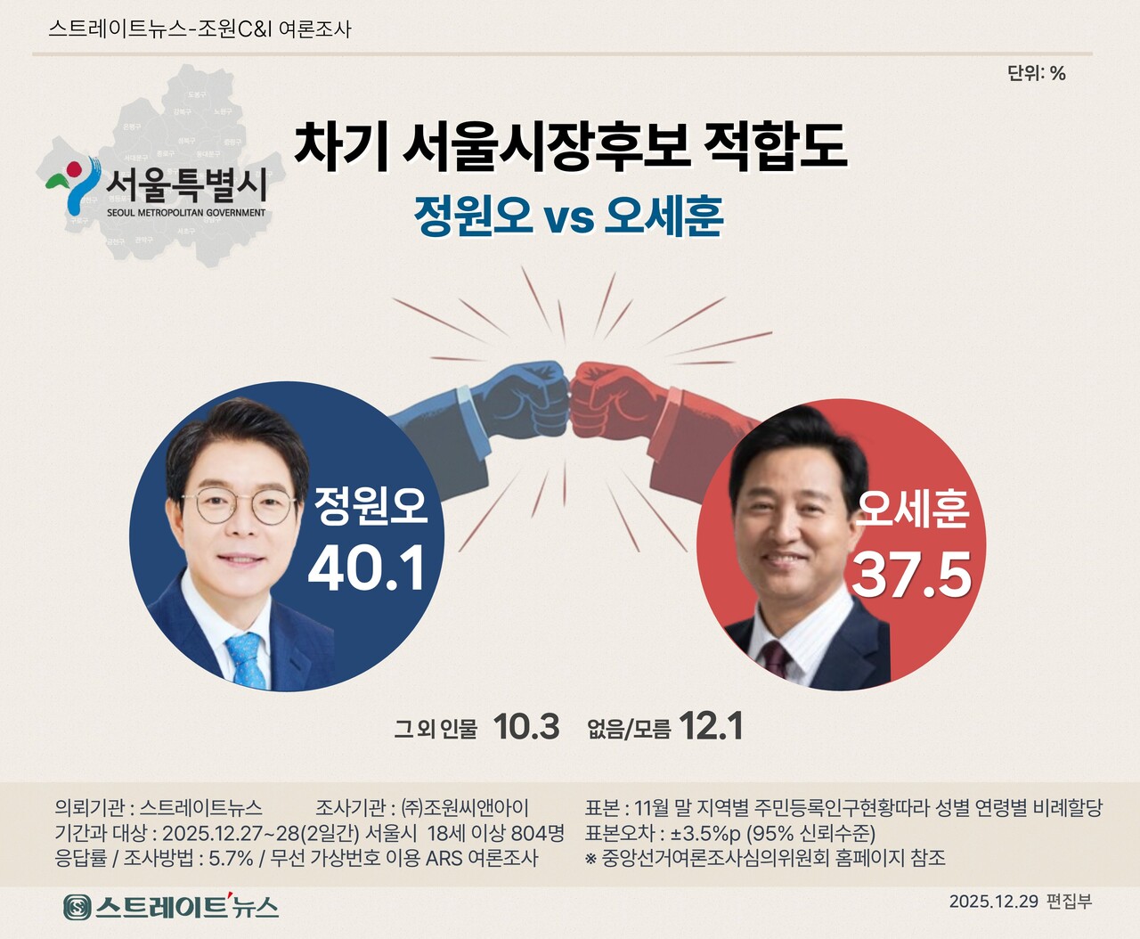 더불어민주당 정원오 성동구청장 40.9%, 국민의힘 오세훈 서울시장 40.4%, '없음' 12%, '잘 모르겠다' 6.7%