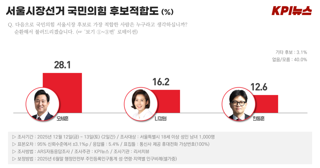 오세훈 시장 26%, 나경원 의원 14%, 한동훈 전 대표 10%, 신동욱 의원 3%, 조은희 의원 1%