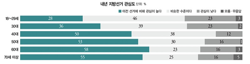 내년 6·3 지방선거에 대한 연령대별 관심도는 60대에서 지난 선거에 비해 높다는 응답이 58%로 가장 높았다. 이어 70세 이상(55%), 50대(53%), 40대(50%), 30대(36%), 18~29세(28%) 순이었다. 연령과 성별을 함께 보면 40대 이상 중장년층과 노년층에서 남성과 여성 모두 높은 관심을 보였다. 특히 50대 여성(64%)과 60대 남성(61%)의 관심이 가장 높았다. 반면 ‘이대남’으로 불리는 18~29세 남성은 이전 선거보다 관심이 높다(27%)는 응답보다 관심이 낮다(32%)는 응답이 많아 가장 낮은 관심도를 보였다. 30대의 경우 여성은 42%가 이전 선거보다 관심이 높다고 응답했고, 남성은 43%가 비슷한 수준이라고 답했다.