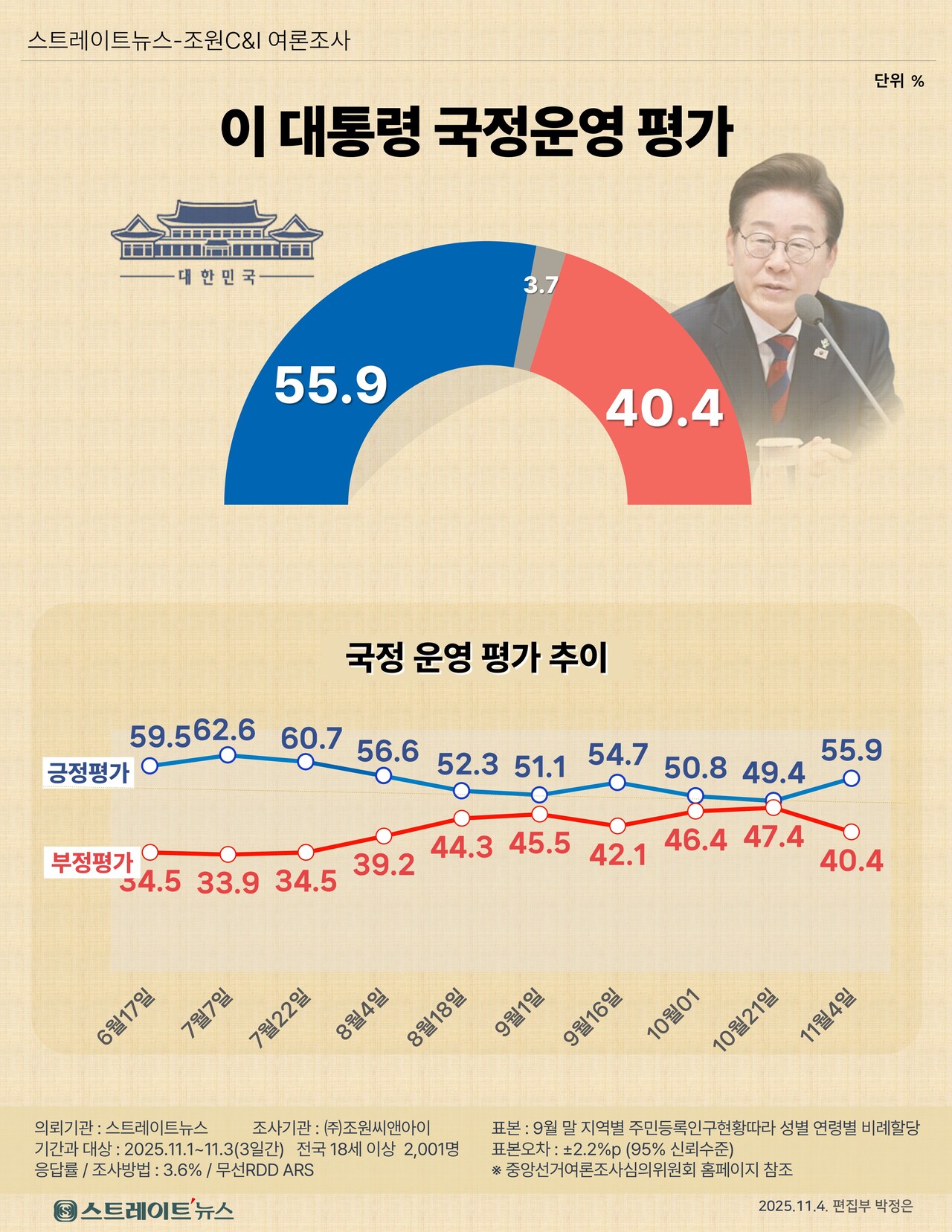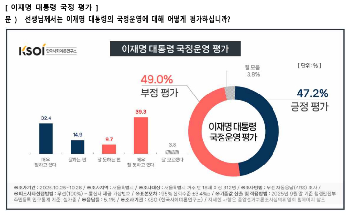 - 국정평가별로는 긍정 응답층에서 '지지 39.5% vs 비지지 22.5%'로 긍정이 우세했으나, 부정 응답층은 '3.2% vs 75.6%'로 부정이 압도적이었다. '모름'(51.8%)에서도 비지지율이 높았다.