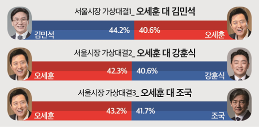 - 이념 성향별로는 오 시장이 보수(36%), 정 구청장이 진보(48%)에서 높은 선호도를 기록한 가운데 중도에선 정 구청장 24%, 오 시장 23%로 접전 양상이었다. 중도층 탈환이 승패를 가를 것으로 보이는 지점이다.