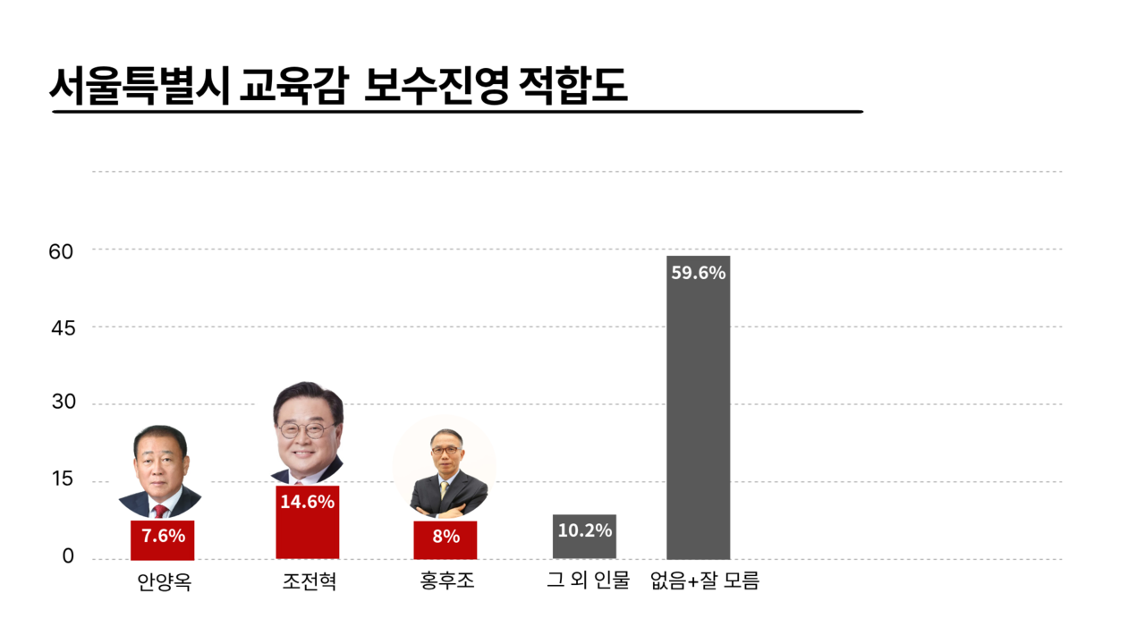 조전혁 전 국회의원 14.6%, 홍후조 현 고려대학교 교수 8.0%, 안양옥 전 한국교원단체총연합회 회장 7.6%, ‘그 외 다른 인물’ 10.2%, “적합한 후보가 없다” 31.8%, “잘 모르겠다” 27.9%
