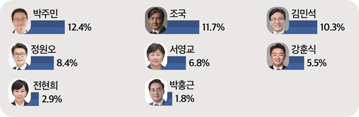 - 성별로는 남성에서 박주민(14.8%), 조국(10.6%), 정원오(9.4%) 순이었고, 여성에서는 박주민(11.6%), 조국(11.5%), 정원오(12.1%)였다.