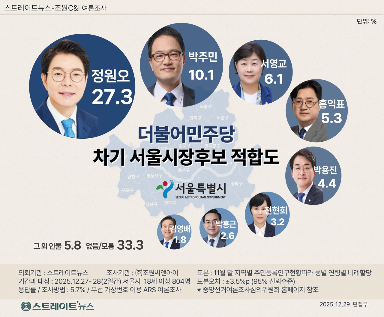 정원오 구청장 27.3%, 박주민 의원 10.1%, 서영교 의원 6.1%, 홍익표 전 의원 5.3%, 박용진 전 의원 4.4%, 전현희 의원 3.2%, 박홍근 의원 2.6%, 김영배 의원 1.8%