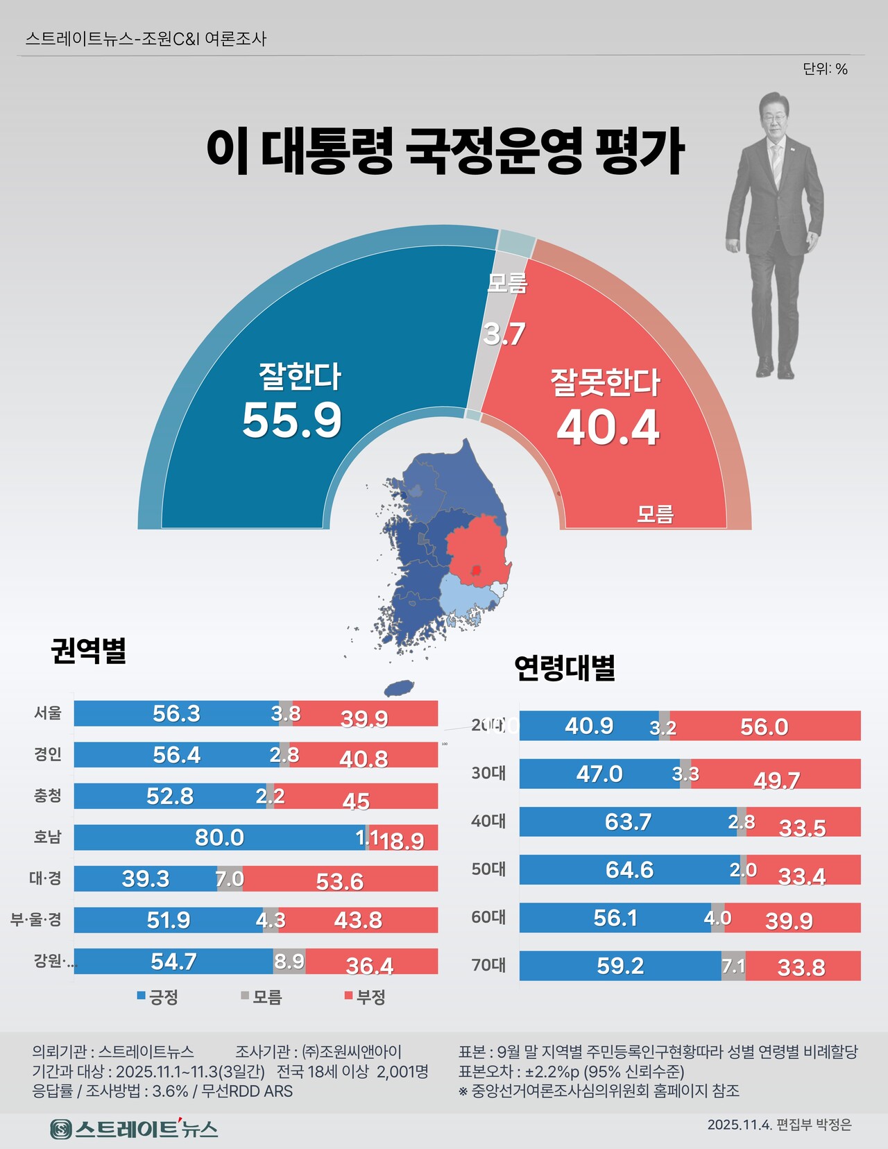 - 연령별로 보면 18~29세 '긍정 14.5% vs 부정 45.5%', 30대 ' 22.3% vs '36.6%', 40대 ' 36.5% vs 39.7%', 50대 '31.5% vs 34.3%', 60대 '31.2% vs 35.3%', 70세 이상 '27.1% vs 47.5%'로 대부분 연령대에서 부정 평가가 우세했고, 특히 18~29세와 70세 이상에서 부정 응답이 높았다.