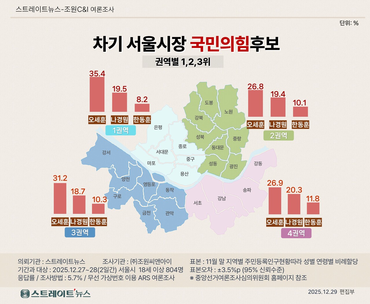 - 이번 조사에서 오 시장은 서울 전 권역에서 선두를 유지했다. 1권역(종로·서대문·중구·용산·마포·은평)에서는 35.4%로 가장 높았고, 3권역(강서·양천·영등포·동작·구로·금천·관악) 31.2%, 2권역(도봉·강북·노원·성북·동대문·중랑·성동·광진) 26.8%, 4권역(서초·강남·송파·강동) 26.9% 순이었다. 나 의원은 4권역에서 20.3%로 상대적으로 높은 지지를 얻었다.