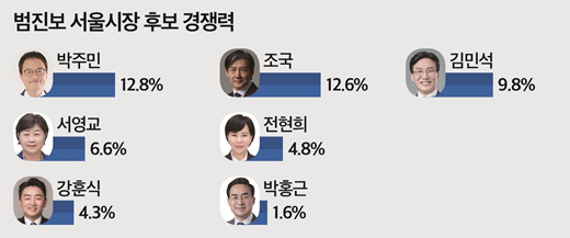 정원오 구청장 21%, 박주민 의원 8%, 조국 조국혁신당 대표 7%, 민주당 서영교 의원과 박용진 전 의원 각각 3%