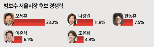 오세훈 시장 23%, 정원오 구청장 19%, 나경원 의원 11%, 조국 대표 8%, 박주민 의원 7%, 한동훈 전 대표 6%, 서영교 의원 3%