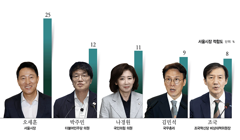 오세훈 현 서울시장 25%, 박주민 더불어민주당 의원 12%, 나경원 국민의힘 의원 11%, 김민석 국무총리 9%, 조국 조국혁신당 비상대책위원장 8%, 강훈식 대통령실 비서실장 4%, 정원오 서울 성동구청장 2%, ‘적합한 인물이 없다’ 14%