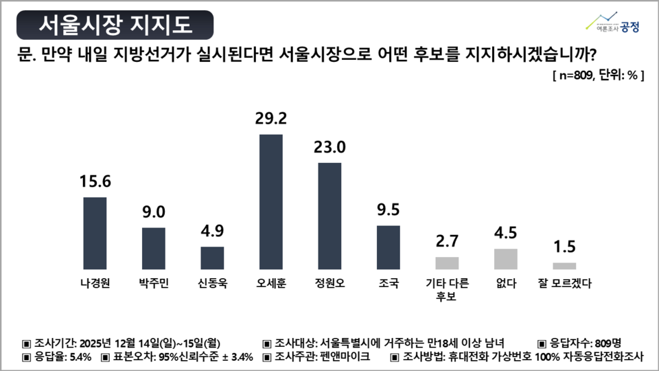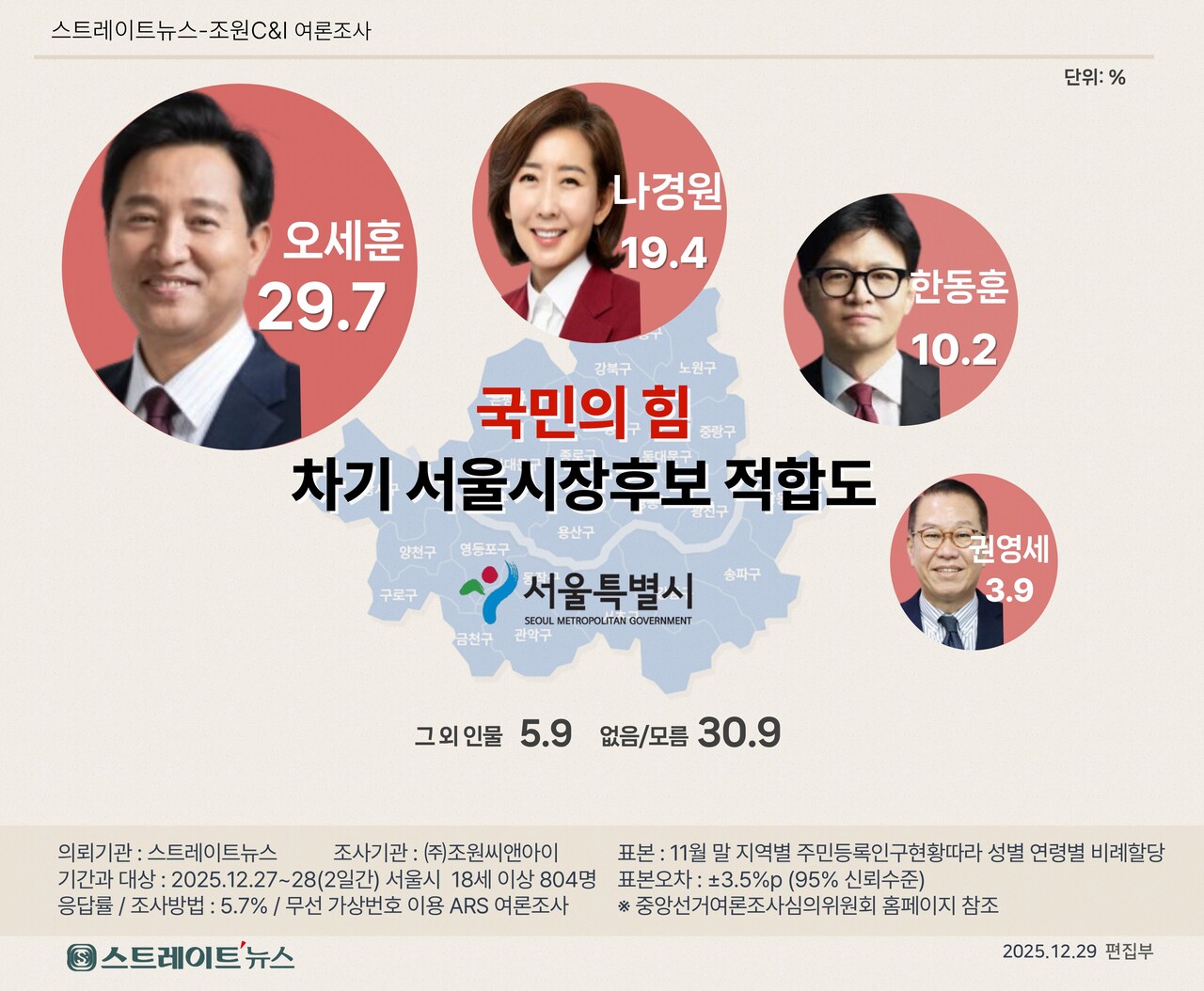 오세훈 시장 29.7%, 나경원 의원 19.4%, 한동훈 전 국민의힘 대표 10.2%, 권영세 의원 3.9%