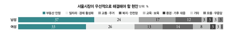 부동산 안정 35%, 일자리 및 경제 활성화 25%, 교통 및 주거 15%, 복지 및 안전망 13%, 교육 및 보육 6%, 환경 및 기후 대응 3%