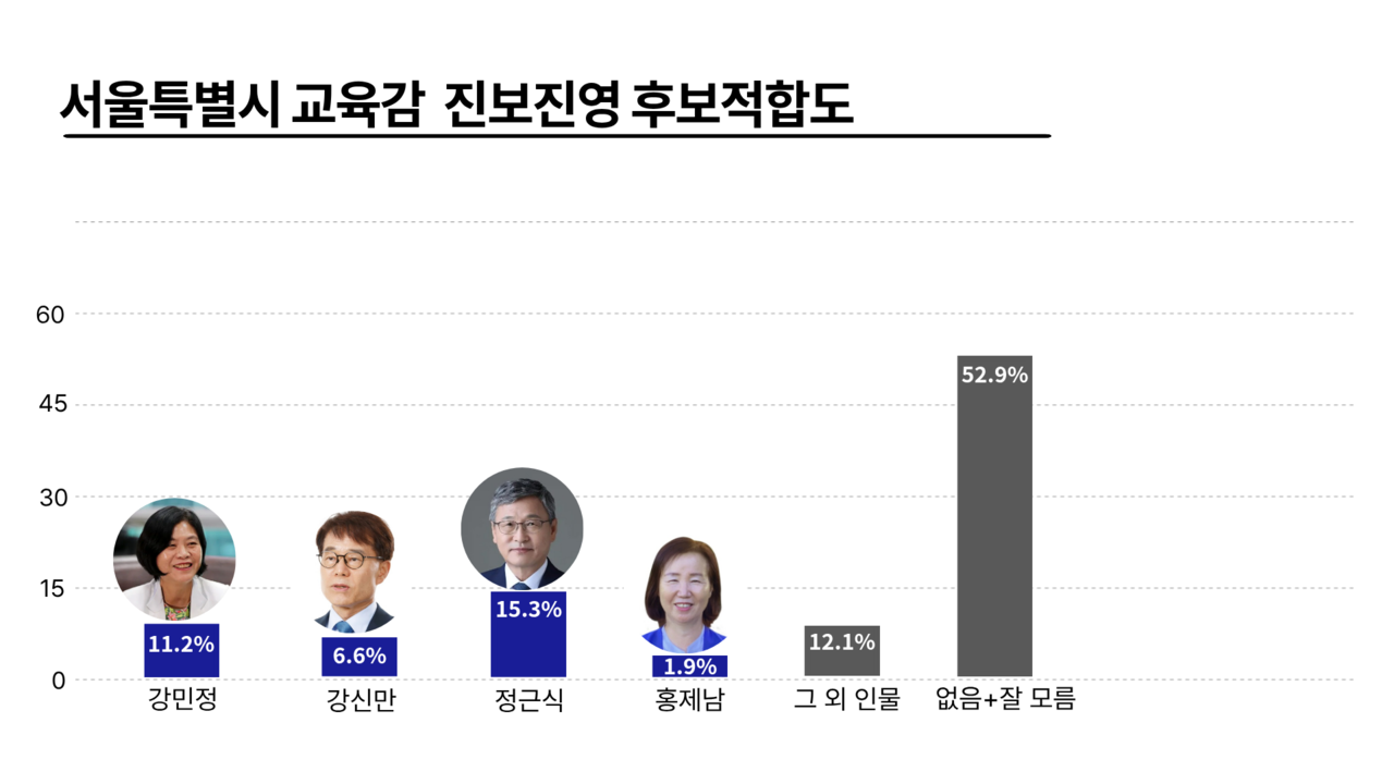 정근식 교육감 15.3%, 강민정 전 국회의원 11.2%, 강신만 전 전교조 부위원장 6.6%, 홍제남 전 서울시남부교육지원청 교육지원국장 1.9%, ‘그 외 다른 인물’ 12.1%, “적합한 후보가 없다” 30.4%, “잘 모르겠다” 22.5%