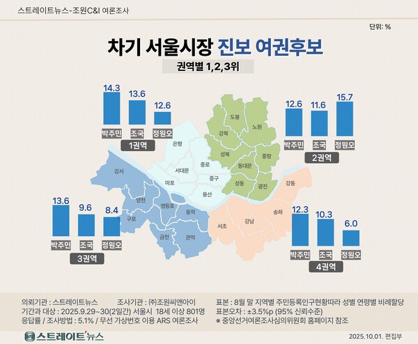 - 1권역(종로·중구·마포 등)에서는 박주민(14.3%), 조국(13.6%), 정원오(12.6%)로 세 후보가 두 자릿수 지지를 기록하며 경쟁 구도를 형성했다. 2권역(노원·성북 등 동북권)에서는 해당 지역 기반 후보인 정원오 성동구청장이 15.7%로 선두에 올랐고, 박주민(12.6%), 조국(11.6%) 순이었다. 3권역(강서·양천·영등포 등 서남권)에서는 박주민(13.6%), 조국(9.6%), 정원오(8.4%) 순으로, 박주민 의원의 우세가 두드러졌다.