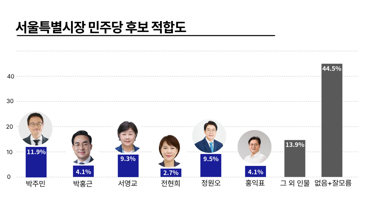 박주민 의원 11.9%, 정원오 성동구청장 9.5%, 서영교 의원 9.3%, 박홍근 의원 4.1%, 홍익표 전 의원 4.1%, 전현희 의원 2.7%, ‘그 외 인물’ 13.9%, ‘적합한 후보가 없다’ 30.5%, ‘잘 모르겠다’ 14.1%
