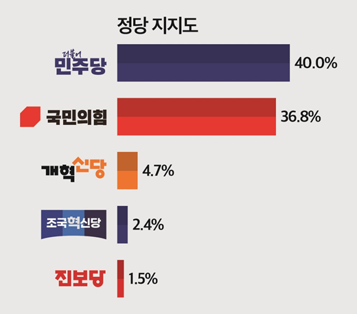 민주당 36%, 국민의힘 30%, 조국혁신당 5%, 개혁신당 4%