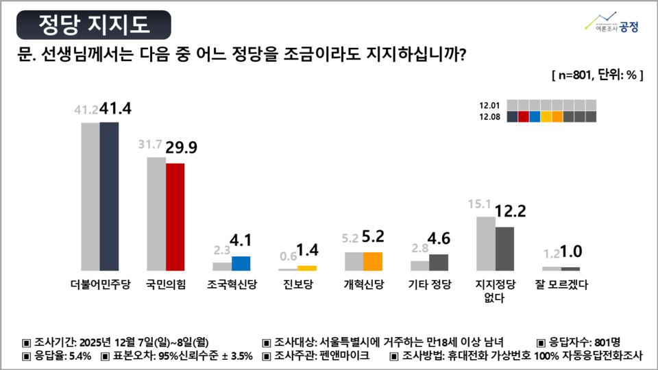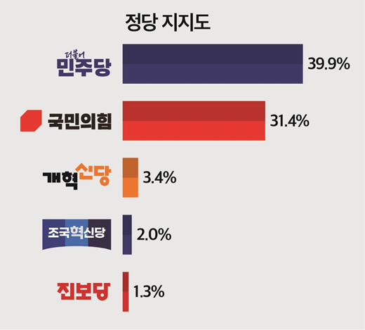 민주당 39.9%, 국민의힘 31.4%, 개혁신당 3.4%, 조국혁신당 2.0%, 진보당 1.3%, '그 외 정당' 2.5%, '지지 정당 없음' 17.5%, '잘 모름' 1.9%