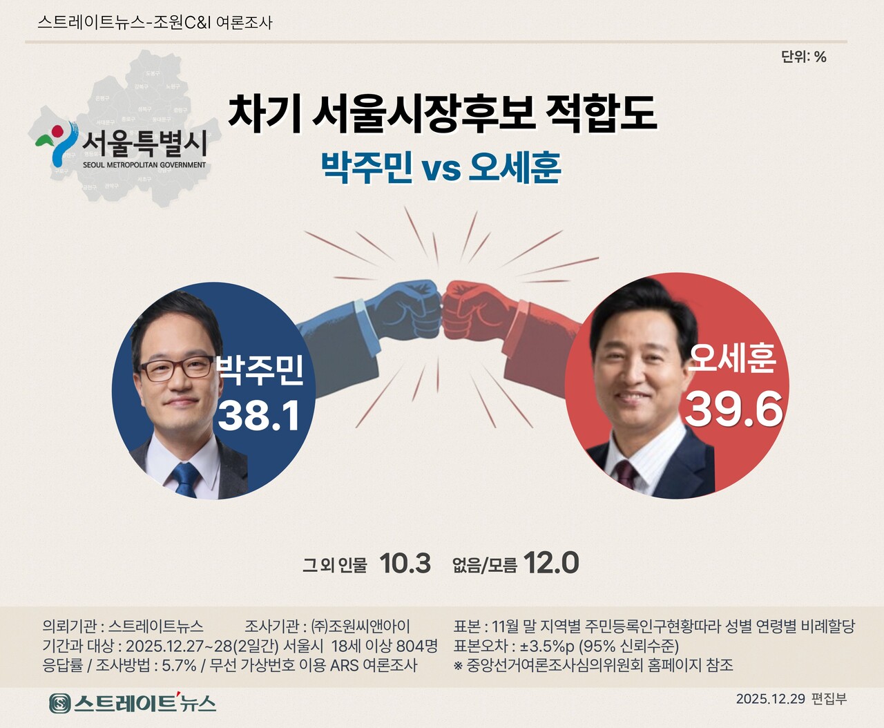 * 이번 조사는 스트레이트뉴스 의뢰로 조원씨앤아이가 27~28일 2일간 서울특별시 거주 18세 이상 남녀 대상으로 ARS로 진행한 결과다(휴대전화 가상번호 100%, 성, 연령대, 지역별 비례할당 무작위 추출). 표본수는 804명(총 통화시도 14121명, 응답률 5.7%)이며 표본오차는 95% 신뢰수준에 ±3.5%포인트다. 가중치 부여 방식은 11월말 행정안전부 발표 주민등록인구기준으로 성별, 연령별, 지역별로 부여했다. 자세한 사항은 중앙선거여론조사심의위원회 홈페이지를 참조하면 된다.