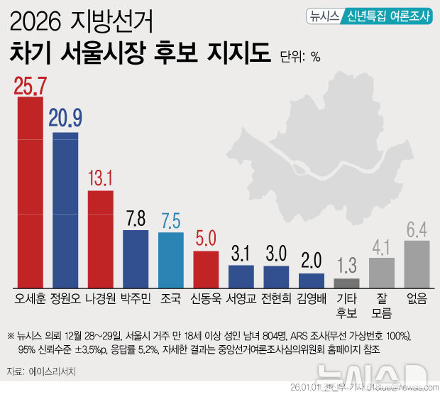 국민의힘 오세훈 서울시장 25.7%, 더불어민주당 정원오 구청장 20.9%, 나경원 국민의힘 의원 13.1%, 박주민 더불어민주당 의원 7.8%, 조국 조국혁신당 대표 7.5%, 신동욱 국민의힘 의원 5.0%, 서영교 민주당 의원 3.1%, 전현희 민주당 의원 3.0%, 김영배 민주당 의원 2.0%, '기타 후보' 1.3%, '없음·잘 모름' 10.5%