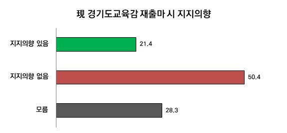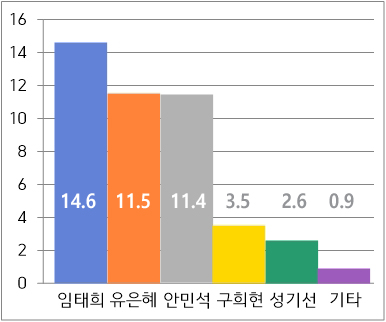 안민석 전 국회의원 15.6%, 유은혜 전 교육부 장관 14.4%, 임태희 현 경기도교육감 14.3%, 성기선 전 한국교육과정평가원장 3.7%, 박효진 현 경기교육연대 상임대표 2.4%, ‘없음·모름’ 49.6%
