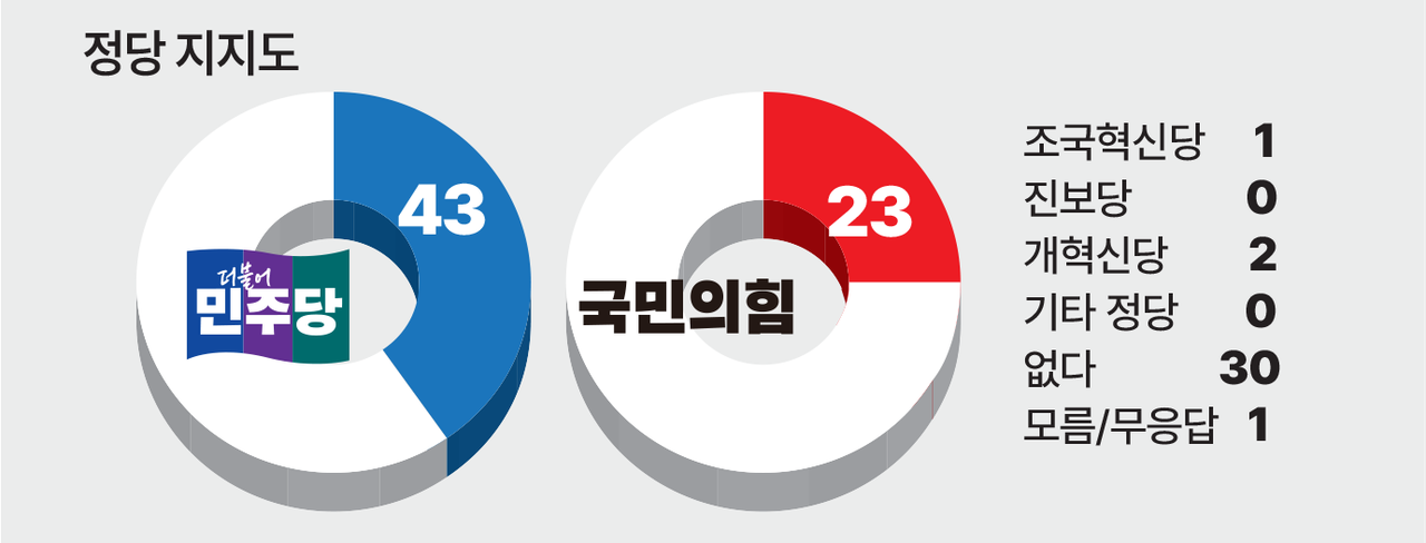 더불어민주당 43.4%, 국민의힘 25.8%, 개혁신당 5.3%, 조국혁신당 4.9%, 진보당 1.4%, 기타정당 2.7%, 지지정당없다 14.5%, 잘 모르겠다 2.0%