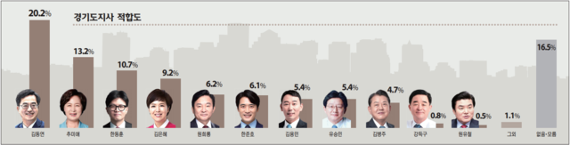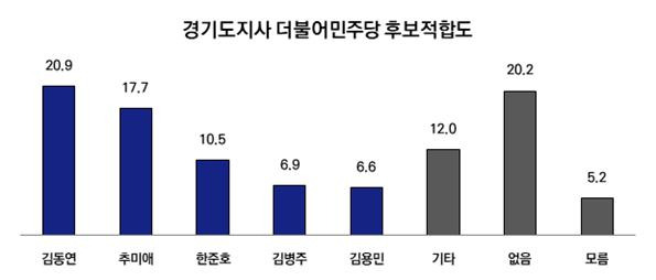 김동연 지사 21.7%, 추미애 위원장 20.6%, 김병주 의원(남양주을) 9.5%, 염태영 의원(수원무) 4.6%, 박광온 전 민주당 원내대표 4.0%, 김영진 의원(수원병) 2.7%, 박정 의원(파주을) 1.7%, ‘잘 모르겠다’ 10.2%, ‘적합한 후보가 없다’ 21.5%