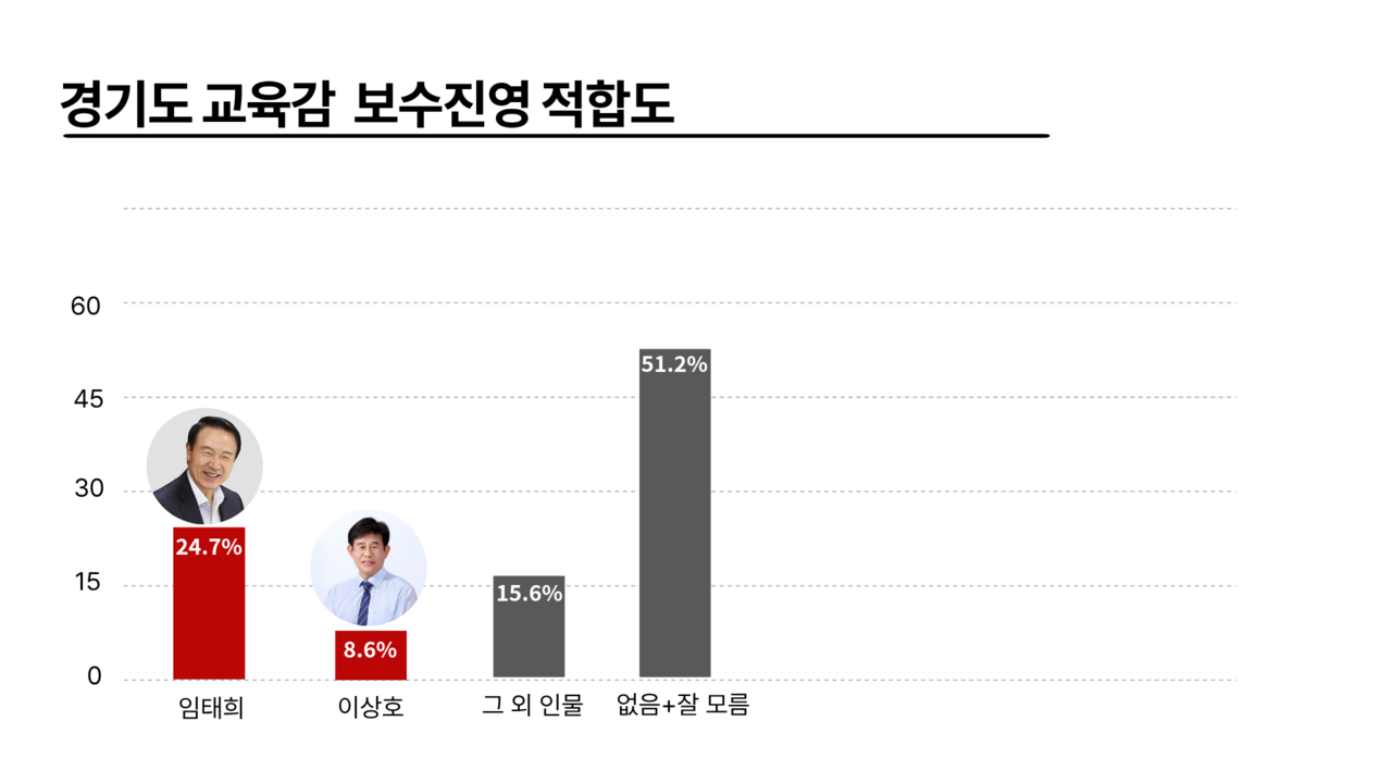 임태희 현 교육감 24.7%, 이상호 경기도교원단체총연합회 회장 8.6%, 그 외 다른 인물 15.6%, 적합한 후보가 없거나 잘 모르겠다 51.2%