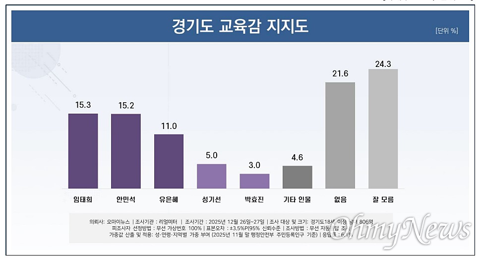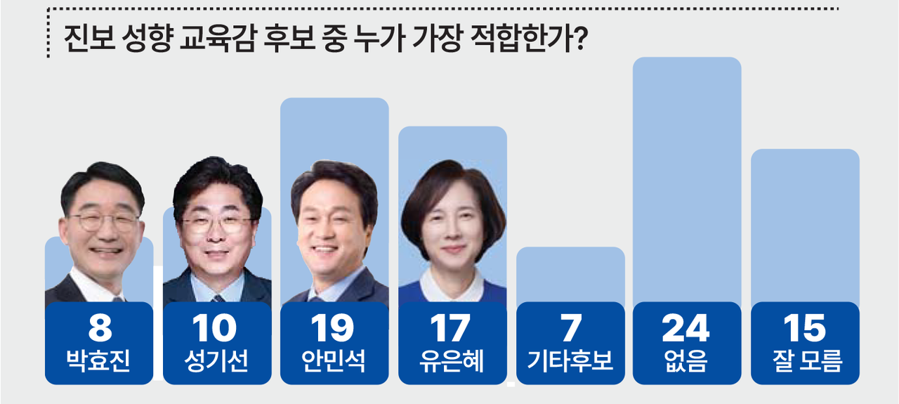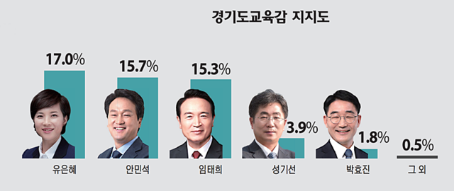 유은혜 전 교육부 장관 17.0%, 안민석 전 의원 15.7%, 임태희 현 경기도 교육감 15.3%, 성기선 전 한국교육과정평가원장 3.9%, 박효진 경기교육연대 상임대표 1.8%, 그 외 0.5%, ‘없음·모름’ 45.9%