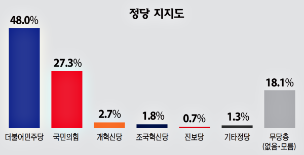 더불어민주당 48.0%, 국민의힘 27.3%, 개혁신당 2.7%, 조국혁신당 1.8%, 기타 정당 1.3%, 진보당 0.7%, 무당층 18.1%