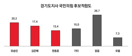 유승민 전 의원 25.8%, 안철수 현 국회의원 17.1%, 김은혜 현 국회의원 16.0%, 원유철 전 국회의원 2.3%, 그 외 0.8%, ‘없음·모름’ 38.1%