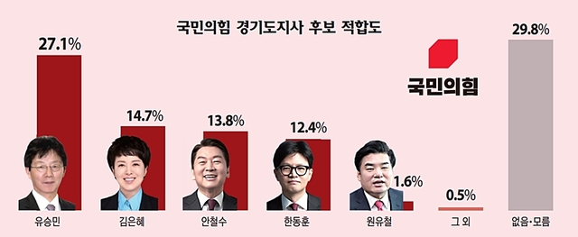 유승민 전 의원 27.1%, 김은혜 의원 14.7%, 안철수 의원 13.8%, 한동훈 전 국민의힘 대표 12.4%, 원유철 전 의원 1.6%, 그 외 0.5%, ‘없음·모름’ 29.8%