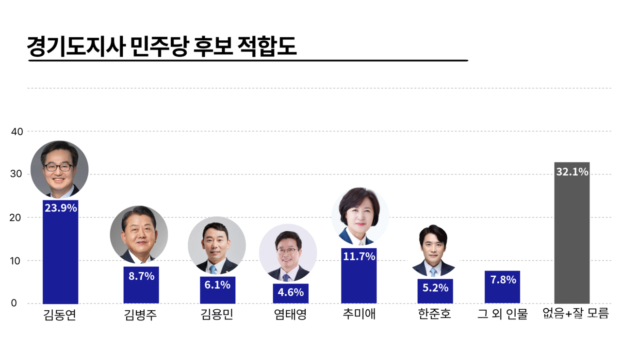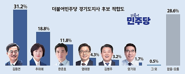 김동연 지사 31.2%, 추미애 국회 법제사법위원장 18.8%, 한준호 의원 11.8%, 염태영 의원 4.3%, 김병주 의원 3.2%, 양기대 전 광명시장 1.7%, 그 외 0.5%, ‘없음·모름’ 28.6%