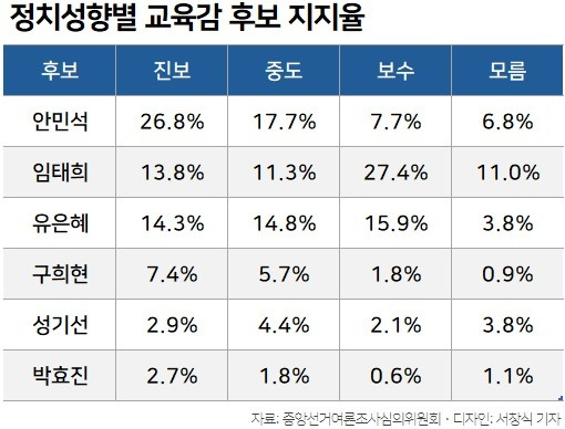 - 연령별로는 18~29세에서 ‘없음·모름’이 56.4%로 가장 높았다. 50대에서는 안민석 전 의원이 24.4%로 두드러졌고 70세 이상에서는 임태희 교육감이 26.2%로 가장 높은 지지를 받았다.
