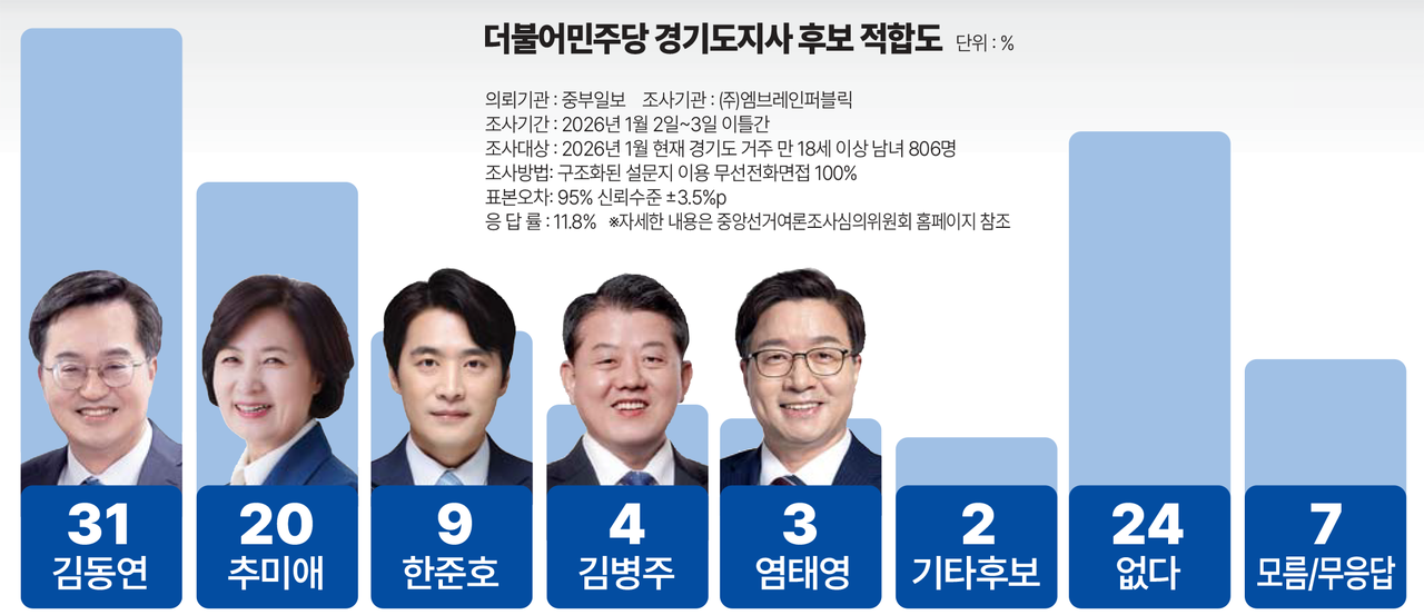 * 이번 조사는 경기일보 의뢰로 조원씨앤아이·리서치앤리서치가 2026년 1월3~4일 이틀간 경기도 거주 만 18세 이상 남녀 대상으로 전화면접(CATI) 여론조사(휴대전화 가상번호 100%, 성, 연령대, 지역별 비례할당 무작위 추출)를 실시한 결과이며 표본수는 1천명(총 통화 시도 1만466명·응답률 9.6%), 표본오차는 95% 신뢰수준에 ±3.1%포인트임. 그 밖의 사항은 중앙선거여론조사심의위원회 홈페이지 참조 ※가중치 부여 방식: 성별, 연령대별, 지역별 가중값 부여(2025년 11월 말 행정안전부 발표 주민등록인구 기준)