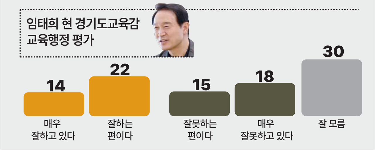 - 경기 지역을 5개 권역으로 나눈 지역별 지지도를 보면, 임 교육감은 1권역(고양·파주·김포) 13.4%, 2권역(동두천·양주·연천·의정부·포천) 10.7%, 4권역(과천·군포·성남·수원·안성·안양·용인·의왕) 14.6%로 다른 후보들을 근소하게 눌렀다.