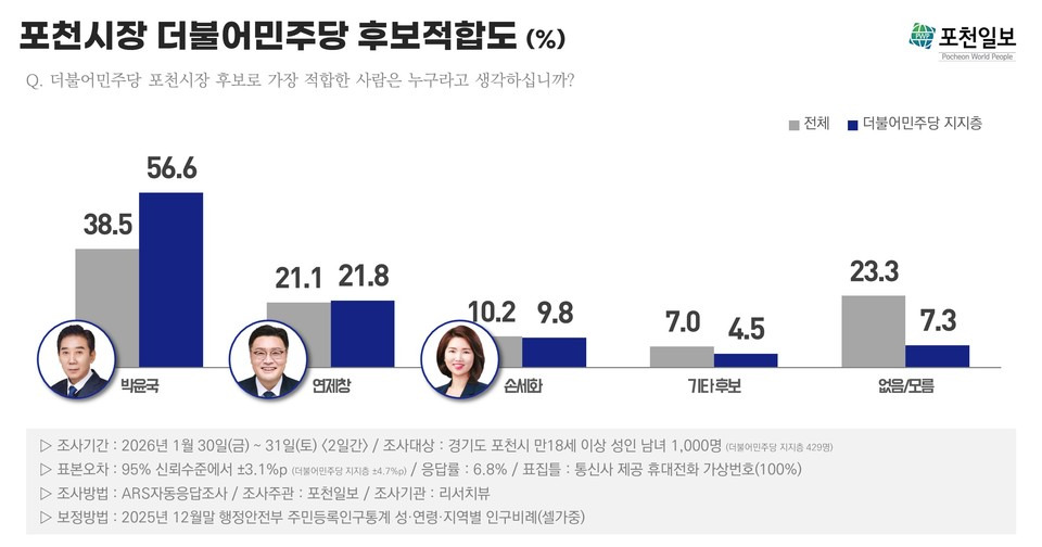 - 정당지지도 조사에서 민주당을 지지한다고 밝힌 응답자의 55.2%는 박윤국 전 포천시장을, 20.6%는 연제창 포천시의회 부의장을 택했다. 손세화 포천시의원은 6.0%, 강준모 전 포천시의회 부의장은 3.8%다.