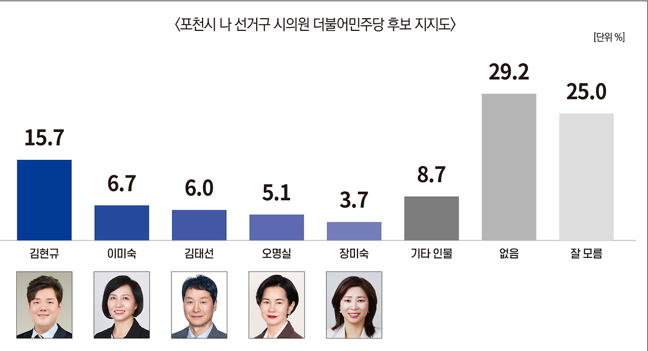 김현규 현 포천시의회 의원 15.7%, 이미숙 전 소흘읍 주민자치위원장 6.7%, 김태선 현 태권도협회 회장 6.0%, 오명실 현 포천시민 햇빛발전협동조합 상임이사 5.1%, 장미숙 전 포천시어린이집연합회 민간분과위원장 3.7%, 기타 인물 8.7%, 없음 29.2%, 잘 모름 25.0%